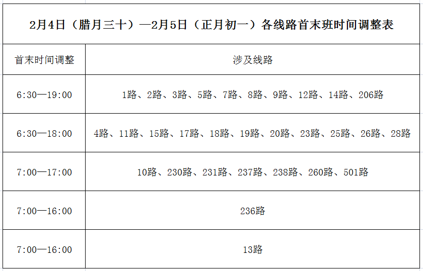 (一)2月4日、5日(三十、初一)首班延后發(fā)車、末班提前收車,具體明細(xì)見下表: